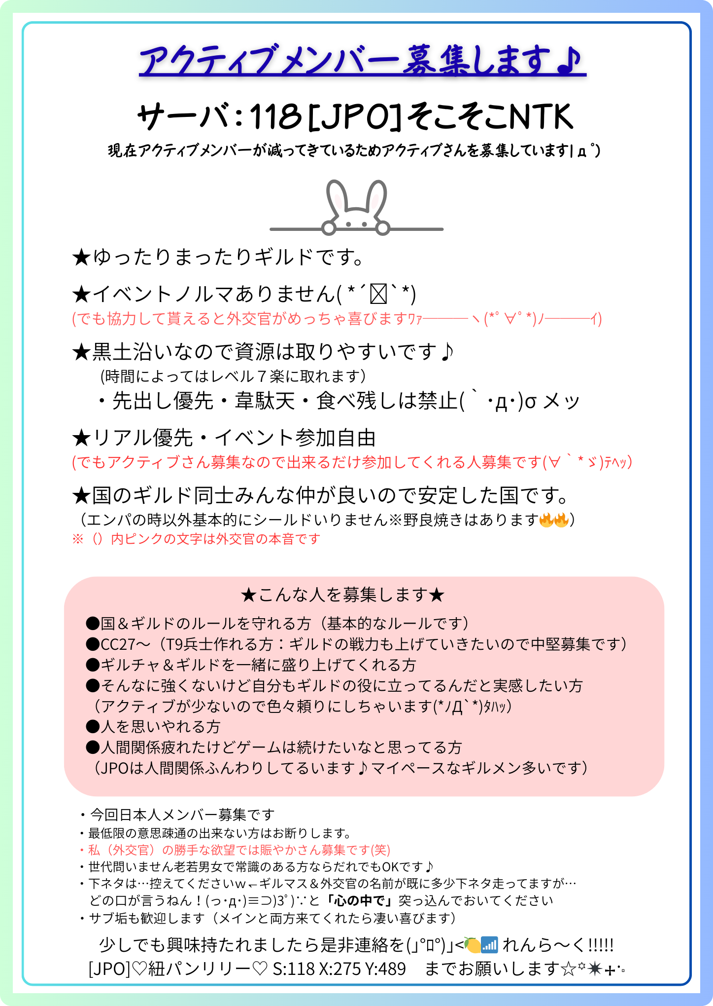 数枠分を募集致します*.ˬ.)) (cc40前後や役職経験者多数在籍・サブギルド併設・初心者さんの受入は難しいです)